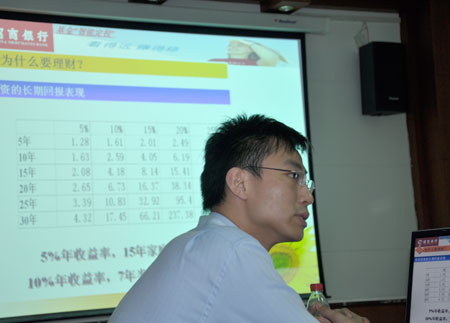 整個培訓(xùn)以探討交流的模式進(jìn)行,主講人從理財角度介紹證券的幾大分類以及投資方式,并結(jié)合自身,對特定的投資模式進(jìn)行了分析。接下來的環(huán)節(jié),主要采取提問回答的方式,根據(jù)要求,主講人回顧了前幾年的金融形勢,以前經(jīng)濟(jì)模式,簡單展望了現(xiàn)在的經(jīng)濟(jì)發(fā)展。隨后從安全性、風(fēng)險性等方面講解了基金、國債、分紅保險、存款的不同特點。整個培訓(xùn)現(xiàn)場異?;鸨?,大家積極發(fā)言,主講人熱情解答,贏得陣陣掌聲。